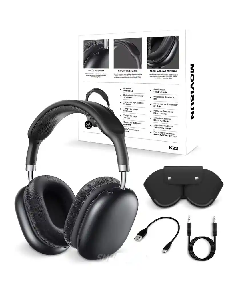 Disfruta de un sonido nítido y comodidad premium con estas Diademas Movisun K22. Con un diseño resistente, batería de larga duración y control fácil con un botón giratorio, son perfectos para usar todo el día. • Sonido de Alta Calidad: Disfruta de un sonido nítido y profundo gracias a su potente altavoz, ideal para todo tipo de música y contenido multimedia. • Bluetooth 5.3: Con la última versión de Bluetooth, disfruta de una conexión más estable y rápida, asegurando mayor compatibilidad con todos tus dispositivos. • Batería de Larga Duración: Con una capacidad de 800 mAh, estos audífonos ofrecen hasta 70 horas de reproducción, de acuerdo al volumen. • Comodidad Premium: Almohadillas de alta calidad que proporcionan un ajuste cómodo y aislamiento sonoro, asegurando una experiencia de uso superior y sin molestias. • Diseño Robusto y Resistente: Cuerpo más ancho y reforzado en la parte frontal, brindando mayor durabilidad y una sensación premium que asegura una larga vida útil. • Botón Giratorio Multifuncional: Controla tu música, llamadas y volumen de manera fácil e intuitiva con el práctico botón giratorio. • Distancia de Transmisión de 10 Metros: Mantén la conexión estable incluso a una distancia de hasta 10 metros de tu dispositivo. • Micrófono: cuentan con un micrófono de calidad inferior, no apto para llamadas. • Estuche Incluido: Protege tus audífonos y llévalos donde quieras con el práctico estuche que se incluye en la caja. Especificaciones: • Bluetooth: Versión 5.3 • Distancia de Transmisión: 10 metros • Tiempo de Espera: 500 horas • Tiempo de Carga: 2 horas • Capacidad de Batería: 800 mAh • Tamaño del Altavoz: 40 mm • Sensibilidad: 101dB ± 3dB • Frecuencia de Transmisión: 2.4 GHz • Rango de Frecuencia: 20Hz – 20kHz • Entrada de Energía: DC 5V / 280 mA • Tamaño de Auricular: 185 x 200 x 82 mm • Protocolos Soportados: A2DP, AVRCP, HSP, HFP Contenido de caja: • 1 Diadema Movisun K22 • 1 Cable de carga • 1 Cable AUX • 1 Estuche