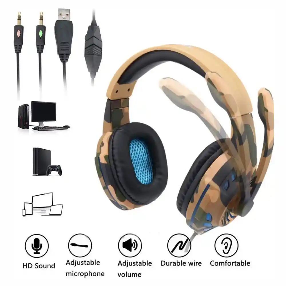Sonido fantástico con efectos realistas. El micrófono de polarización omnidireccional capacitiva de 36 dB le ofrece una alta calidad de voz. Diseño de camuflaje único con aspecto elegante. El diseño ergonómico con suaves orejeras de poliuretano y el material de la diadema es cómodo. Alta compatibilidad con teléfono móvil, tableta, ordenador, MP3. Diseño especial para PS4 ¡Tus Juegos, Tus Sonidos, Tu Música, Tu Vida! Los auriculares perfectos para vivir tus vídeo juegos, con almohadillas de excelente calidad que no dejaran sentir molestias en tus oídos durante horas si lo prefieres, con cancelación de ruidos exteriores que te darán máxima concentración. CARACTERÍSTICAS: Tamaño de bocina: 40mm Impedancia: 32ohms Rango de frecuencia: 20hz-20khz Largo del cable aproximado 2 metros Voltaje de trabajo de led: dc 5V Conectores de audio y micrófono independientes de pkug 3.5mm Con control de volumen e interruptor de silencio para el micrófono NOTA: El conector USB solo alimenta la iluminación Led. No incluye cable adaptador de audio. Lo que obtienes con tu compra 1 x Audífonos Gamer 30 Días de garantía por defectos de fabricación. -Recuerda que la vida útil de tu PRODUCTO depende directamente de su uso. Por esto mismo te recomendamos seguir todas las instrucciones que trae cada artículo al pie de la letra y leer el manual de GARANTÍA.