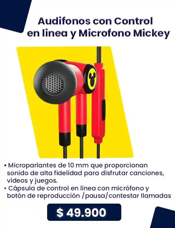 • Audífonos de Mickey Mouse livianos • Microparlantes de 10 mm que proporcionan sonido de alta fidelidad para disfrutar canciones, videos y juegos • Compatible con productos electrónicos que cuentan con un puerto de 3.5 mm (TRRS), como teléfonos inteligentes, tabletas o reproductores de medios • Almohadillas suaves para los oídos que aíslan el ruido y ofrecen un calce perfecto con diferentes tamaños, para garantizar un ajuste personalizado • Cápsula de control en línea con micrófono y botón de reproducción/pausa/contestar llamadas