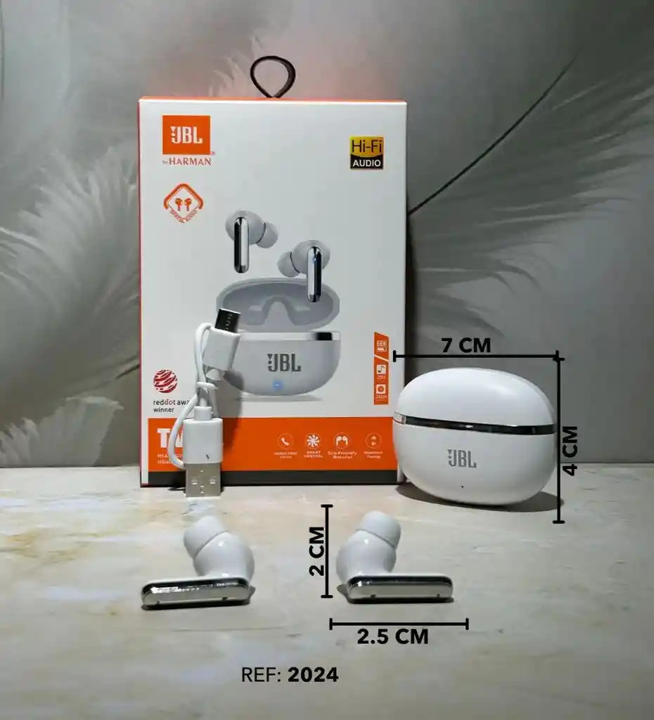 *💥 AUDÍFONOS INALÁMBRICOS JBL TWS *• FUNCIÓN:* Reproducción de audio inalámbrica de alta calidad y llamadas manos libres. *• CARACTERÍSTICAS:* • Diseño: Auriculares in-ear con estuche de carga compacto. *• MEDIDAS:* 5 CM de ancho x 4.5 CM de alto.