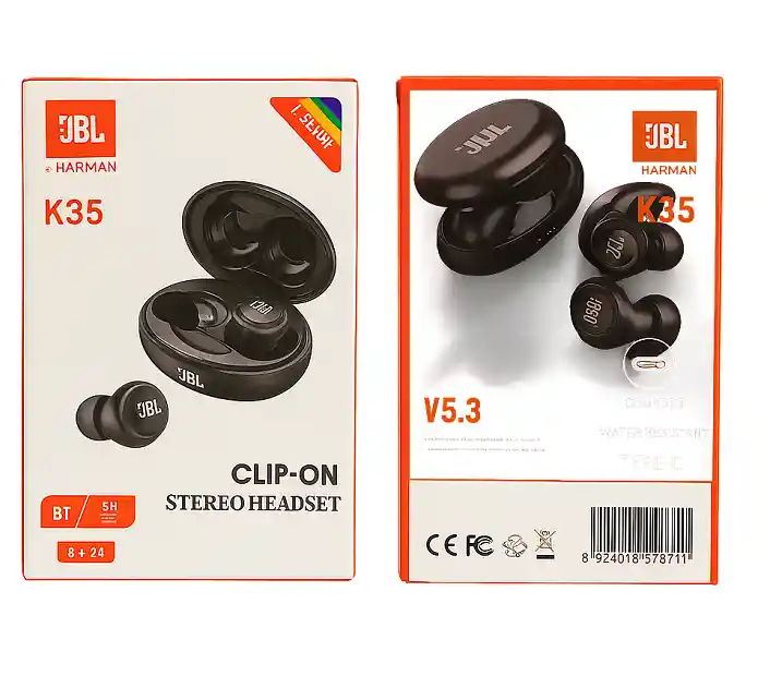 Jbl GENERIC K35 Generic Clip-on de Conducion Auricular Bluetooth inalámbrico-base-duraciòn larga ¡Descubre los impresionantes audífonos JBL CLIP ON! ¿Estás listo para una experiencia auditiva excepcional? Los JBL CLIP ON son mucho más que unos simples audífonos: son tu entrada a un mundo de sonido sin igual. Permíteme guiarte a través de las características que hacen que estos audífonos sean imprescindibles para cualquier amante de la música y el estilo de vida activo. Bluetooth 5.3 para una conectividad sin problemas: Con la última tecnología Bluetooth 5.3, olvídate de los molestos cables y enredos. Conectar tus audífonos a tu dispositivo es un juego de niños. Además, la conexión estable garantiza que puedas disfrutar de tu música sin interrupciones, sin importar dónde te encuentres. Sonido envolvente de alta calidad: Sumérgete en un sonido excepcional con los JBL CLIP ON. Cada nota, cada detalle, se reproduce con una claridad impresionante. La calidad del sonido JBL te permitirá escuchar tu música favorita como nunca antes lo habías hecho. ¡La música cobra vida! Diseño elegante en forma de arete: No solo son unos audífonos, son una declaración de estilo. Su diseño en forma de arete es elegante y moderno, lo que los hace destacar en cualquier ocasión. Ya sea que los uses para hacer ejercicio o para una noche en la ciudad, los JBL CLIP ON complementarán tu estilo. Seguros y resistentes al sudor: La comodidad es clave, y estos audífonos están diseñados para permanecer en su lugar sin importar cuán activo sea tu estilo de vida. Además, su resistencia al sudor significa que puedes llevarlos contigo al gimnasio o a tus aventuras al aire libre sin preocuparte por dañarlos. En resumen, los audífonos JBL CLIP ON son mucho más que unos simples audífonos Bluetooth. Son una inversión en tu experiencia musical y en tu estilo de vida activo. Con un sonido envolvente de alta calidad, controles táctiles intuitivos y un diseño elegante, no podrás resistirte a su atractivo. ¿Listo para elevar tu experiencia auditiva? ¡Haz clic para comprar los JBL CLIP ON ahora y prepárate para vivir la música como nunca antes!