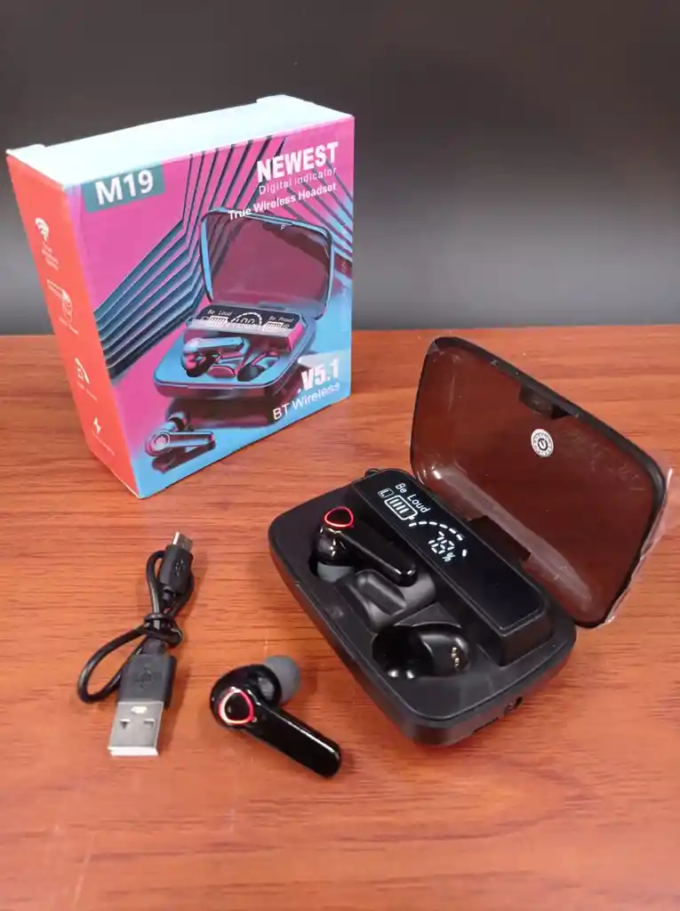 Los audífonos M19 son bluetooth, recargables con una duración entre 1 y 3 horas el uso continuo, caja con indicador de batería, función power bank, vienen con cable de carga cada uno. Entrega gratis en Bogotá