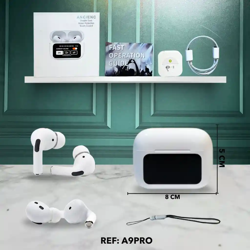 *💥 AURICULARES INALÁMBRICOS A9PRO 💥* *• FUNCIÓN:* Reproducción de audio inalámbrica con control táctil y reducción de ruido activo y ambiental. *• CARACTERÍSTICAS:* • Tecnología ANC/ENC (Active/Environmental Noise Cancellation). • Diseño similar a los AirPods Pro. • Color: Blanco. • Estuche de carga con pantalla o indicador visual. • Incluye cable de carga y una guía de operación rápida. *• MEDIDAS:* 8 CM de ancho x 5 CM de alto. *• REFERENCIA: A9PRO.* *