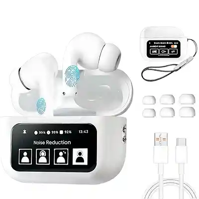 Descripción del Producto ¡Lleva el control total en tu estuche! Olvídate de sacar tu celular para todo. Estos innovadores Audífonos con Pantalla te permiten gestionar tu música, llamadas y ajustes directamente desde el estuche de carga inteligente. Características principales: Pantalla Táctil Full Color: Controla el volumen, pasa canciones y visualiza el nivel de batería de cada audífono y del estuche. Cancelación de Ruido Activa (ANC): Bloquea el ruido exterior para una experiencia de audio inmersiva y cristalina. Control Remoto para Cámara y TikTok: Dale "Me gusta" a tus videos favoritos o toma fotos a distancia con un solo toque en la pantalla del estuche. Localizador Inteligente: Función "Encontrar mis auriculares" para que nunca los pierdas de vista. Personalización Avanzada: Cambia el fondo de pantalla y ajusta el ecualizador según tu estilo.