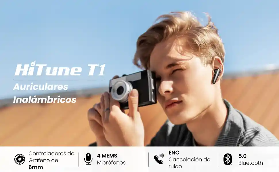 Descripción Auriculares inalámbricos de 4 micrófonos Estos auriculares Bluetooth5.0 adoptan el chipset AB1536 de Ariha, que admite la nueva tecnología TWS MCSync. Los 4 micrófonos MEMS incorporados no solo proporcionan un audio superior y llamadas cristalinas, sino también una conexión perfecta con una latencia imperceptible. La brillante cancelación de ruido aísla eficazmente el ruido ambiental incluso en el tráfico. Funciona perfectamente con iOS, Android, macOS y otros dispositivos con Bluetooth. Modo de ecualización excelente HiTune T1 está equipado con avanzados controladores dinámicos de grafeno de 6 mm, la música rica y bastante detallada le permite escuchar cada elemento. Estos auriculares inalámbricos han sido mejorados con el modo EQ que viene con ajustes de bajos bien equilibrados y profundos, establece la melodía correcta para su mejor. Mediante el control táctil se puede ajustar fácilmente la configuración del ecualizador, el control de volumen, saltar canciones, el asistente de voz activo, etc. Bastante cómodo Los auriculares HiTune T1 con cancelación de ruido tienen un diseño ergonómico, con un ángulo especial de 30° para una mayor comodidad durante todo el día. Viene con varias almohadillas de silicona, con tamaños desde XS / S / M / L que serán adecuados para todo tipo de personas. Diseño ultraligero con sólo 4,9g y soporte IPX5 a prueba de agua, que lo protege contra el sudor y las salpicaduras de agua. La mejor opción para hacer footing, yoga, ciclismo, viajes al trabajo, reuniones de zoom, FaceTime, viajes, etc. Batería de larga duración Los auriculares inalámbricos HiTune también son compatibles con la carga rápida USB C. Una sola carga proporciona hasta 5 horas de reproducción y el estuche de carga ofrece más de 24 horas para mantenerlos en movimiento. Tanto los auriculares como el estuche de carga pueden cargarse completamente en 1,5 horas. Con una carga de 15 minutos se consigue hasta 1 hora de reproducción. Calidad impresionante Los auriculares inalámbricos HiTune T1 están fabricados con un material de tacto suave, sin huellas dactilares, que proporciona una experiencia extraordinaria. El interruptor de efecto Hall permite el emparejamiento en un solo paso y la reconexión automática con los últimos dispositivos emparejados de forma inmediata. Los auriculares Bluetooth a prueba de futuro para una vida inalámbrica inteligente. Contenido del paquete 1 x Auriculares inalámbricos HiTune T1 1 cable de carga USB-C 4 almohadillas de silicona (XS / S / M / L) 1 manual de usuario —Garantía del producto Garantía del producto 12 meses por defecto de fabrica, no cubre daños ocasionados por golpes, malas conexiones, desgaste normal, efectos externos (polvo, humedad, descargas eléctricas), manipulación técnica por personal no autorizado. Guardar la factura para efectos de la garantía.