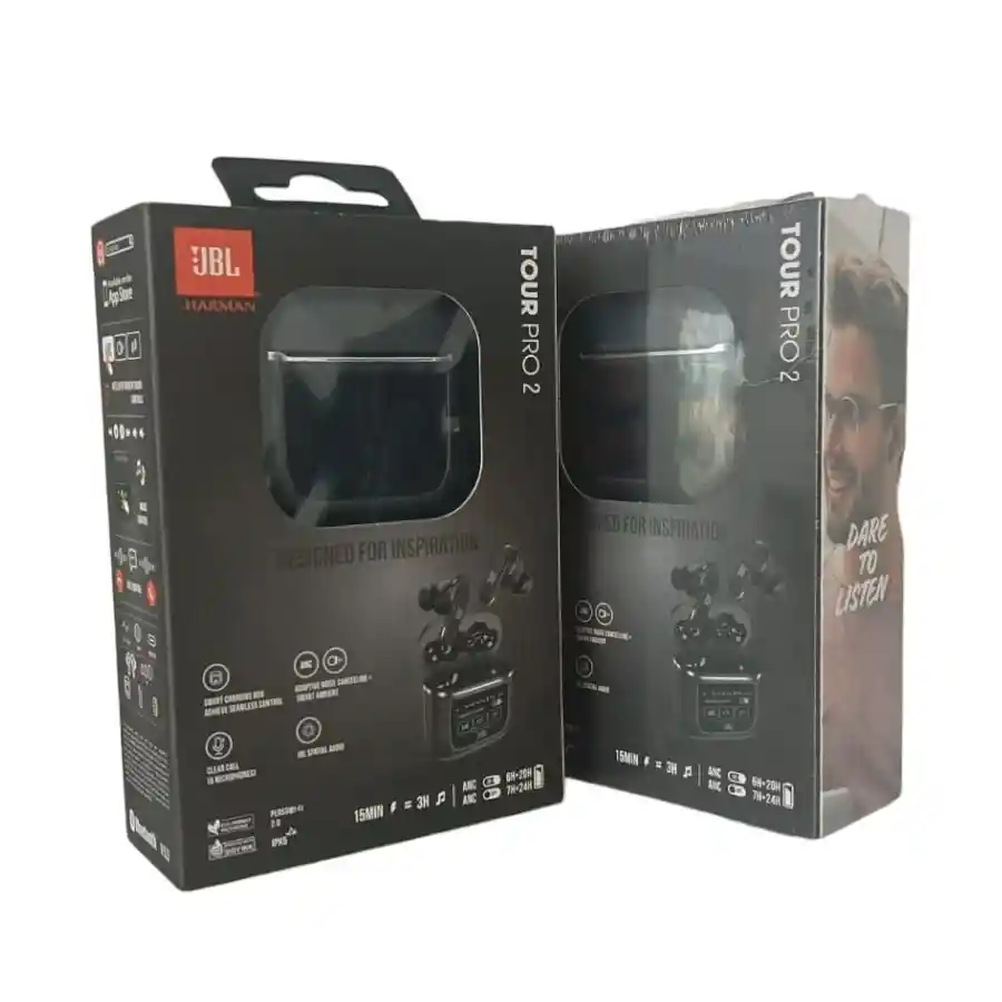 Auriculares JBL Tour Pro 2 Los JBL Tour Pro 2 son auriculares inalámbricos de última generación que combinan tecnología, comodidad y sonido premium. Su cancelación de ruido adaptativa te permite aislarte del mundo y disfrutar de tu música o llamadas con total claridad.Características principales: Estuche de carga inteligente con pantalla táctil integrada de 1.45”, para controlar música, llamadas, notificaciones y batería sin usar el celular. Sonido JBL Pro con graves profundos, medios balanceados y agudos cristalinos. Cancelación de ruido adaptativa y modos Smart Ambient para elegir entre aislamiento total o conciencia del entorno. Micrófonos de alta calidad (6 en total) para llamadas nítidas en cualquier ambiente. Bluetooth 5.3 con conexión multipunto para usar con varios dispositivos. Gran autonomía, con hasta 40 horas combinadas con el estuche de carga. Compatibles con asistentes de voz como Google Assistant y Alexa. Los JBL Tour Pro 2 no solo te ofrecen música de calidad, sino una experiencia completa de conectividad, comodidad y control.La tecnología True Adaptive Noise Cancelling de los JBL Tour Pro 2, elimina las distracciones para que puedas disfrutar de tu audio favorito con el legendario sonido JBL Pro, o del silencio si lo prefieres, con un sonido espacial impecable estés donde estés.El exclusivo estuche de carga inteligente te permite acceder directamente a todas las funciones clave de los auriculares sin usar la aplicación para smartphones. Se puede acceder a todas las funciones de la aplicación a través de la funda inteligente incluso desde dispositivos que no sean teléfonos inteligentes, como ordenadores portátiles, PC, televisores, etc. Controla las funciones clave de la aplicación JBL Headphones sin usar el teléfono, simplemente tocando la pantalla del estuche de carga de 1,45 pulgadas, para una experiencia realmente perfecta. Sumérgete en el audio espacial durante hasta 40 horas con una sola carga gracias al innovador estuche de carga inteligente con Bluetooth NO RESISTENTES AL AGUA Producto RÉPLICA 1. 1