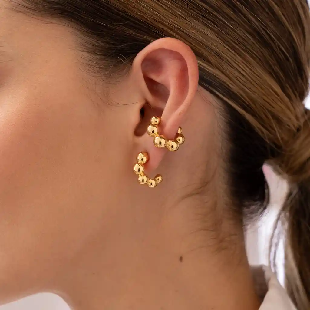 Elaborados Zamak (aleación de metales) con baño de oro de 24k. Postes antialérgicos Incluye: 1 par de candongas y 1 earcuff. NO SE PONEN NEGROS Garantía en los aretes de 2 meses en el baño. Para usar nuestros earcuffs no necesitas perforación. Hecho a mano en Colombia Ten presente que algunas de las fotos de apoyo incluyen otros productos que se venden por separado. Nuestras earcuff y earpartys son tendencia! Nada más cool que combinar muchos aretes y earcuffs de diferentes tamaños y formas con toda seguridad serás el centro de las miradas. ¿Es un regalo? Incluye en tu compra nuestro empaque de regalo y sorprende a esa persona especial.