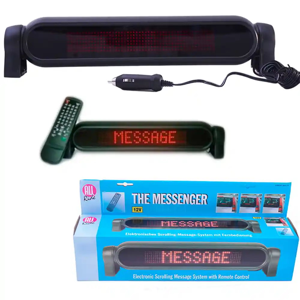 AVISO ELECTRÓNICO EN LED PROGRAMABLE PASAMENSAJES ALL RIDE NJK-175 NEGRO DESCRIPCIÓN: Ruteros en servicio público, Anunciador de precios y promociones, Campañas publicitarias, mensajería comercial, Decoración, etc. 10 memorias, 470 caracteres en total. control remoto para programación ¡¡ Ideal como rutero en transporte público o Local comercial cuenta con adaptador de corriente de 110v !! ********** EL BARATILLO TE TRAE ESTE SUPER DESCUENTO, APROVECHA YA UNIDADES LIMITADAS!!! ********** CARACTERÍSTICAS DEL PRODUCTO: •Voltaje de alimentación: 12 VDC con cable y conector para encendedor de cigarrillos. •Consumo máximo de corriente: 1 Amp pantalla full encendido y 350 mA en promedio. •Temperatura de operación: -10°C ~ 70°C. •Numero de leds: 350 leds color Rojo. Matriz de 7 x 50 leds. •Dimensiones: Largo 43cm, Ancho 7,5cm, Alto 9,5cm. •Peso: 655 gramos. •Área luminosa del texto :23cm x 3.7cm DESTACADO DEL PRODUCTO: • 10 Memorias, hasta 80 caracteres por memoria y 470 caracteres en total. • Memoria latente (los mensajes permanecen grabados aun después de apagado). • Velocidad variable de los mensajes. • Secuencia de reproducción de memorias a voluntad del usuario. • Diferentes niveles de brillo. • 99 mensajes pre-programados (en inglés). • Inversión de la imagen para reflejar en un espejo. • Angulo de visibilidad ajustable (360°). Rotación sobre los soportes. • Decorativo, durable, novedoso. • Portátil. • Fácil de usar e instalar. • Fabricado en Policarbonato y ABS con protección UV. CONTENIDO DE LA CAJA: • 1 Aviso programable 12VDC con cable (4 mts) y conector para encendedor de cigarrillos. • 1 Control Remoto. • 2 Pilas AAA. (NO INCLUIDAS) • 2 Adhesivos doble faz. • 1 Manual de Instrucciones. • 1 Adaptador de corriente de 110v