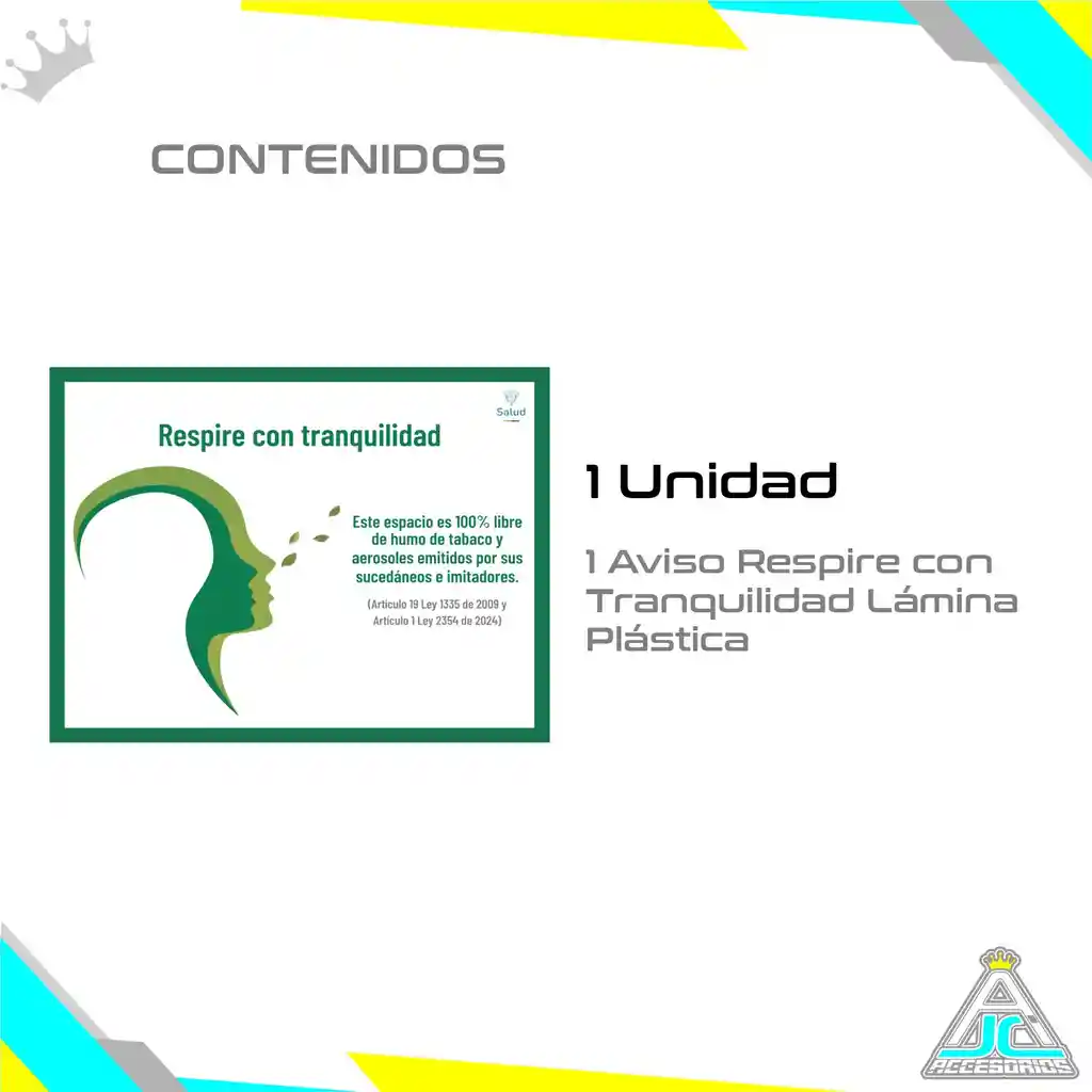 Aviso Espacio 100% Libre de Humo 20x15cm O 15X20cm Cumple con la normativa y promueve ambientes saludables con este aviso informativo de excelente calidad, ideal para espacios comerciales e institucionales. ° Medidas: 20 cm ancho x 15 cm alto O 15cm alto x 20cm ancho, con las medidas que desees ° Material: Lámina plástica rígida ° Impresión: Alta resolución ° Acabado: Laminado protector resistente al agua y al sol ° Uso: Interior y exterior ° Instalación: Superficie lisa y limpia Incluye: - 1 Aviso “Respire con Tranquilidad” Este aviso informa que el espacio es 100% libre de humo de tabaco y aerosoles, conforme a la normativa vigente. Garantía del vendedor: 30 días