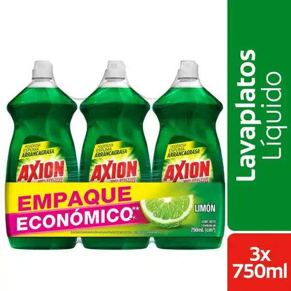 Deja impecable tu vajilla con el Lavalozas Líquido Axion Limón, su presentación de 3 botellas con 750 ml cada una es ideal para ti y tu familia. Este Lavalozas te ayudará a eliminar los restos de alimentos, grasa o cualquier tipo de suciedad que se almacenan en platos, ollas y sartenes. Su fórmula concentrada acaba con los gérmenes que ocasionan malos olores en tu cocina neutralizándolos con su fresca fragancia a limón. Basta con unas gotitas para que su espuma se active, ya no habrá necesidad de utilizar fibras que dañen trastes o sartenes con material antiadherente. ¡Prueba ahora el Axion Limón Líquido!