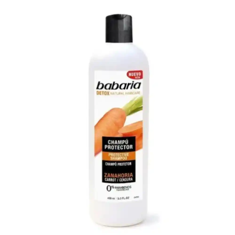 Babaria Shampoo Protector Zanahoria 400ml: 0% parabenos. El Aceite de Zanahoria es conocido por sus propiedades protectoras del cabello frente a procesos oxidativos y antiradicalarias. Por lo que en combinación con el resto de ingrediente protege y repara los cabellos