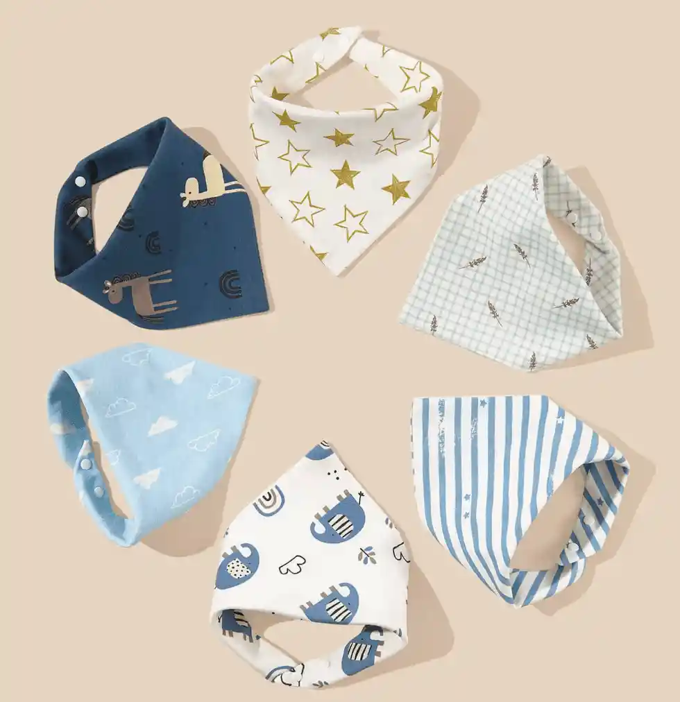 Baberos para bebé, diseños variados, elaborados en algodón muselina, suaves, transpirables y altamente absorbentes, ideales para proteger la ropa durante la alimentación y la dentición. Cuentan con diseño triangular y delicados patrones de niño, pensados para brindar comodidad y estilo al mismo tiempo. Su textura ligera cuida la piel sensible del bebé y permite un uso diario confortable.