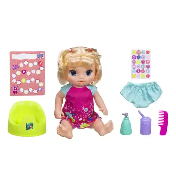 La Muñeca Bebé va al Baño de Baby Alive Lleva Ropa Interior de Niño Mayor, Así Que Tiene Que Usar la Bacinica. Los Niños Pueden Compartir Importantes Momentos Con su Bebé Jugando a Que la Ayudan a Usar la Bacinica. Cuando la Muñeca Tiene Sed, Llena el Biberón Con Agua y Dale de Beber. Ahora Tiene Que ir al Baño. Tómala de Las Manos y Bailará. Ayúdala a Sentarse en la Bacinica y Ella Cantará e Irá al Baño. No te Preocupes, el Único Lugar Que Moja es la Bacinica. Recuerda Jugar a Que le Lavas Las Manos y Pon Una Etiqueta en su Tabla de Premios Para Mostrarle Que lo Hizo Muy Bien. Los Pequeños Adorarán Vestir Esta Muñeca Articulada Con la Ropa Incluida, Peinarla y Escuchar Todas Las Cosas Graciosas Que Dice. Incluye: Muñeca, Bacinica, Biberón, Peine, Ropa Interior, Jabón de Manos de Juguete y Tabla de Premios Con Etiquetas. Baila, Habla y Parpadea. Bebe Agua y va al Baño en la Bacinica. Dice Más de 50 Frases y Sonidos en Inglés y Español Para Mami o Papi. Marca su Progreso Con Etiquetas Una Tabla de Premios. La Muñeca Viene Con Adorable Ropa Removible y Ropa Interior de Niño Grande. Edad Recomendada: Más de 3 Años en Adelante. Peligro de Asfixia: Incluye Piezas Pequeñas. Nota: Un Adulto Debe Retirar y Desechar Los Amarres y Materiales Del Empaque.