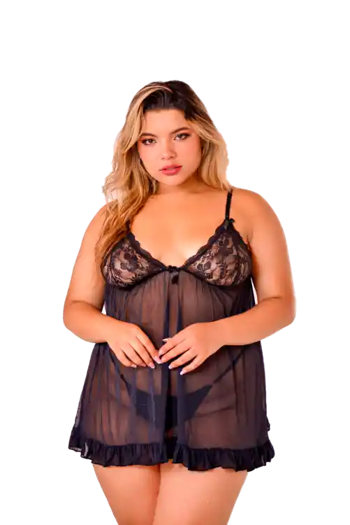 DESCRIPCION. SET: 2 piezas ( 1 baby doll y 1 panty ) TALLA: XL Y XXL COLOR: Negro y Rojo COMPOSICION DE TELAS: Mallatex (poliester 94%, spandex 6%), Blonda (91% Nylon, 9% expandes) y Herrajes metalicos.