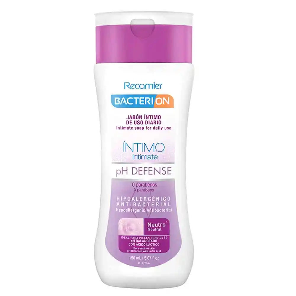 El jabón íntimo de Bacterion contiene ácido láctico, que regula el pH de la zona íntima de la mujer y es un potencial hidratante. Limpia suavemente la zona íntima femenina gracias a su fórmula antibacterial, hipoalergénica, extra suave, libre de parabenos y enriquecida con ácido láctico que respeta el pH natural. packing: Botella