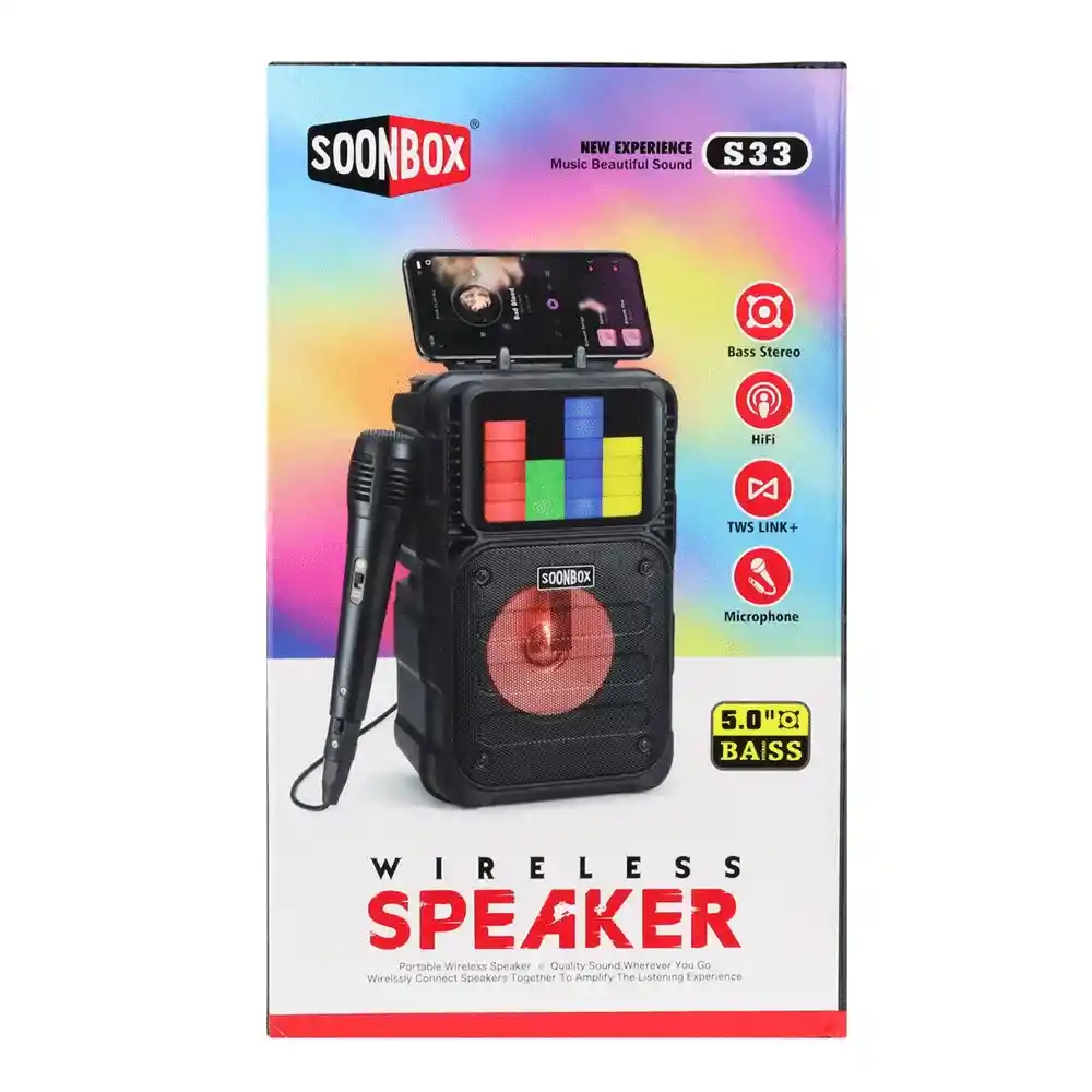 · Bluetooth V5.0 · Bocinas 4 Plg · Lector memorias USB y SD, FM · TWS · 5W · Luces LED · Batería 1,200 mAh · Alto 20 cms · Entrada mic