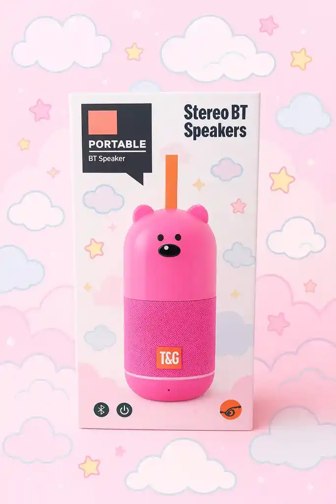 Bafle Portátil Bluetooth T&G Estéreo – Diseño Oso Rosa Descripción: Disfruta de tu música favorita con estilo gracias a este bafle portátil Bluetooth T&G con diseño en forma de osito. Su tamaño compacto y ligero lo hace perfecto para llevarlo a cualquier lugar, mientras que su potente sonido estéreo garantiza una experiencia envolvente. ✔️ Conexión inalámbrica BT estable ✔️ Diseño tierno y moderno en color rosa ✔️ Práctica correa para transportarlo fácilmente ✔️ Ideal para fiestas, reuniones o uso personal •Un bafle divertido y funcional que combina potencia de sonido con un diseño adorable.
