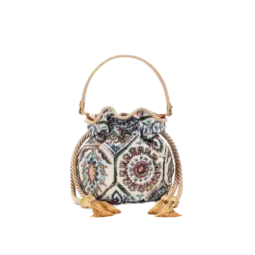 Elaborado en Jacquard y Cuero Vacuno 100% Colombiano. El Sistema de Cierre Con Cordones de Hilo de Seda Con Terminal de Borlas Hechas a Mano. Hecho Con Herrajes Con Baño en Oro de 24K. Medidas: Alto 21 cm x Ancho 24 cm