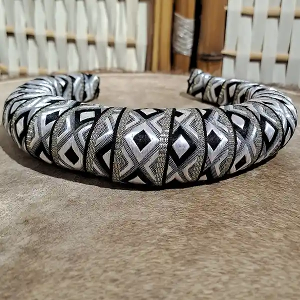 Es una diadema flexible como base, forrada y decorada en su alrededor con textil recuperado dándole forma voluminosa y creando firmeza con puntadas a mano. Inspiración: Esta inspirado en las reinas de la época 1500 - 1600 d.c. Upcycling: Nuestros productos son únicos ya que reutilizamos textiles para mitigar un poco más la carga de la industria de la moda. Beneficios: Son piezas que no aprietan, no tallan ni molestan. Horman la cabeza para mayor ajuste. Nuestras joyas crean un efecto de empoderamiento y belleza a la hora de colocárselos. Manejamos textiles de excelente calidad Garantía: Nuestros productos tienen 6 meses de garantía (No se devuelve dinero, solo se cambia por un producto de la misma referencia o del mismo valor, en caso de no tener el mismo valor y superarlo, el cliente tiene que asumir y pagar el excedente). Lavado: Estos son piezas que no se pueden meter en lavadoras ni secadoras. Se limpia con un pañito semi húmedo y con Frotex como jabón para desmanchar No aplicarle ni químicos, Clorox, Varsol, entre otros productos. Dejar secar al clima Recomendaciones: Para evitar que tu producto corra el riesgo de mancharse o dañarse por algún líquido, recomendamos guardar en su mismo empaque después del uso. Se puede utilizar con todo tipo de ropa, tanto monocromático como contrastado. Se usa un poco más adelante de la mitad de la cabeza Se puede usar sobre el cabello o recogiéndolo (Esto va a gusto de la persona) La diadema va detrás de las orejas. Se puede usar en el diario, trabajo, vacaciones o para eventos especiales (Esto va a gusto de la persona)