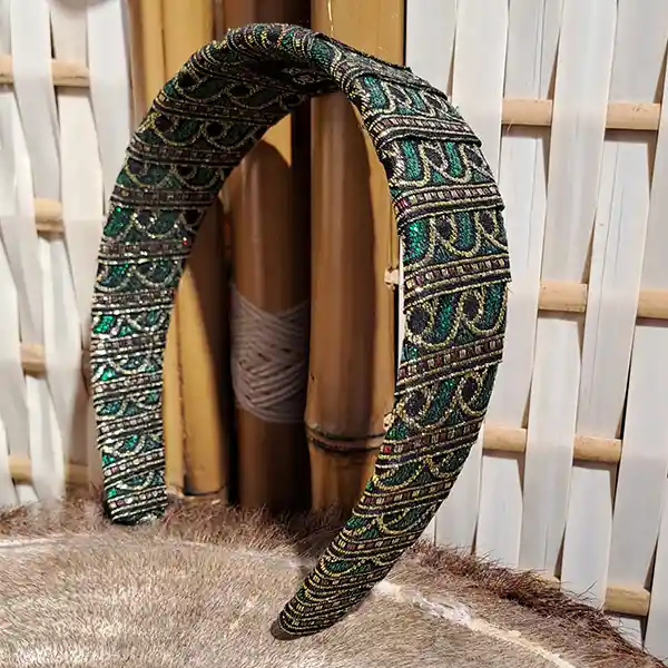 Es una diadema flexible como base, forrada y decorada en su alrededor con textil recuperado dándole una forma plana y creando firmeza con puntadas a mano. Inspiración: Está inspirada en uno de las artistas matronas musicales de Colombia, Toto la Momposina, con su éxito llamado "Pescador". Upcycling: Nuestros productos son únicos ya que reutilizamos textiles para mitigar un poco más la carga de la industria de la moda. Beneficios: Son piezas que no aprietan, no tallan ni molestan. Horman la cabeza para mayor ajuste. Nuestras joyas crean un efecto de empoderamiento y belleza a la hora de colocárselos. Manejamos textiles de excelente calidad Garantía: Nuestros productos tienen 6 meses de garantía (No se devuelve dinero, solo se cambia por un producto de la misma referencia o del mismo valor, en caso de no tener el mismo valor y superarlo, el cliente tiene que asumir y pagar el excedente). Lavado: Estos son piezas que no se pueden meter en lavadoras ni secadoras. Se limpia con un pañito semi húmedo y con Frotex como jabón para desmanchar No aplicarle ni químicos, Clorox, Varsol, entre otros productos. Dejar secar al clima Recomendaciones: Para evitar que tu producto corra el riesgo de mancharse o dañarse por algún líquido, recomendamos guardar en su mismo empaque después del uso. Se puede utilizar con todo tipo de ropa, tanto monocromático como contrastado. Se usa un poco más adelante de la mitad de la cabeza Se puede usar sobre el cabello o recogiéndolo (Esto va a gusto de la persona) La diadema va detrás de las orejas. Se puede usar en el diario, trabajo, vacaciones o para eventos especiales (Esto va a gusto de la persona)