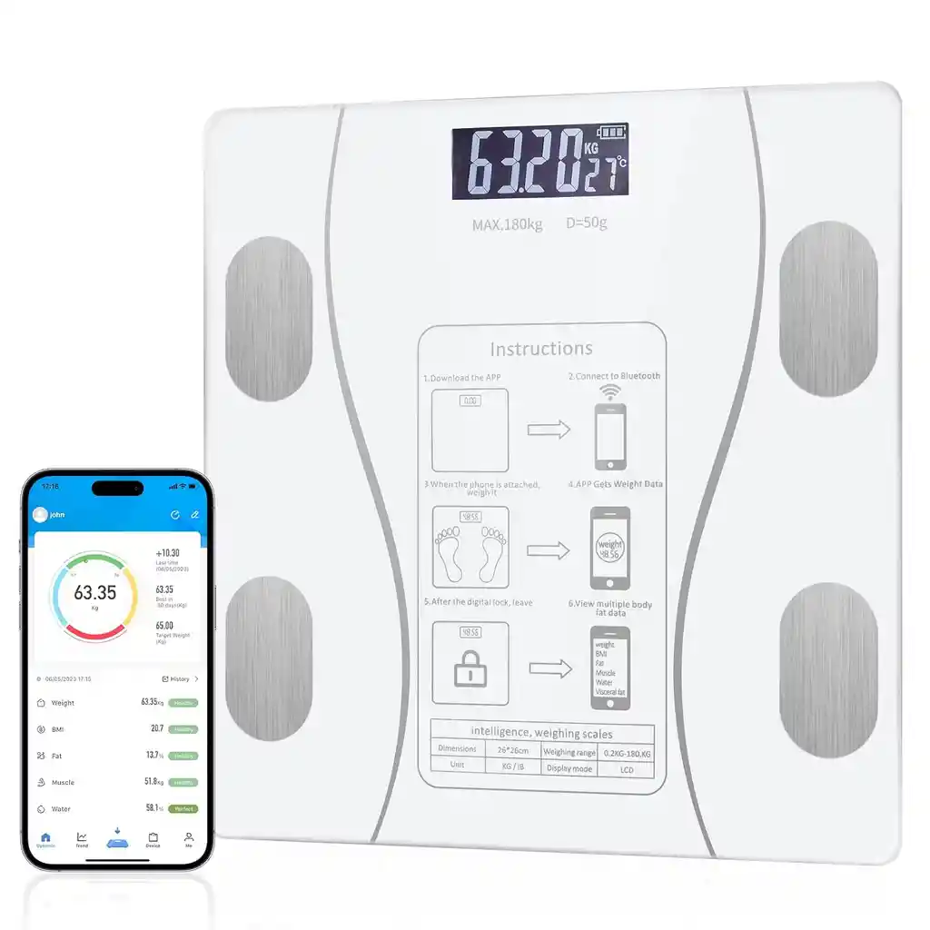 Tu aliada perfecta para el cuidado de tu salud. Con una capacidad de hasta 180kg, esta báscula te ofrece mediciones precisas de peso corporal, grasa corporal, masa muscular, masa ósea, y más. Su tecnología bluetooth te permite sincronizar los datos con tu smartphone para llevar un registro detallado de tu progreso a lo largo del tiempo. Con su diseño elegante y pantalla LCD de fácil lectura, es ideal para cualquier hogar. CARACTERÍSTICAS - Mediciones precisas: Proporciona mediciones precisas de peso corporal, grasa corporal, masa muscular, masa ósea y más. - Conexión Bluetooth: Se puede conectar a tu smartphone a través de Bluetooth para almacenar y rastrear tus datos. - Registro de datos: Permite llevar un registro detallado de tu peso y otras mediciones a lo largo del tiempo. - Con una pantalla LCD de fácil lectura que muestra claramente tus mediciones. - Diseño elegante: Su diseño moderno y elegante lo hace adecuado para cualquier hogar u ambiente. - Plataforma de Vidrio Templado: La plataforma de vidrio templado garantiza resistencia y seguridad durante su uso. ESPECIFICACIONES - Rango de meidición: 0,2kg ~ 180kg. - Fuente de alimentación: dos (2) pilas AAA (incluidas). - Opciones de medición: kilogramos y libras. - Monitor: LCD. - Temperatura para el trabajo: 10°C ~ 35°C. - Apagado automático después de unos segundos sin uso. CONTENIDO - Una (1) balanza. - Dos (2) pilas AAA. GARANTÍA - Tres (3) meses por defectos de fábrica.