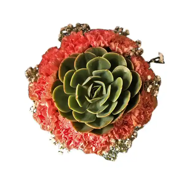 Base en balde metálico colores surtidos con claveles y suculenta. El color de la flor será según disponibilidad en tienda. Medidas 19 cms. de alto por 15 cms. de ancho