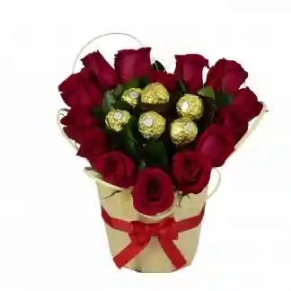 12 rosas con chocolates en madera