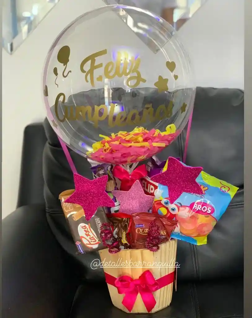 VALDE DE MADERA DECORADO CON GLOBO AEROSTÁTICO PERSONALIZADO, TARJETA Y MOÑO, CONTIENE CHOCOLATE, GALLETA, CHOCOMELO, GOMITAS, DULCES VARIADOS