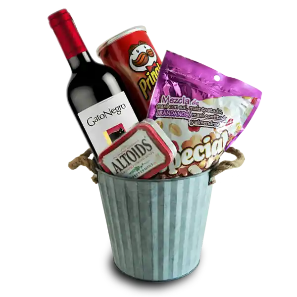 Si quieres un regalo diferente. invitarlo (s) a una rumbita es una muy buena opción. este lindo detalle incluye una botella de vino. maní grande. mentas. papas Pringles grandes. latón matálico.