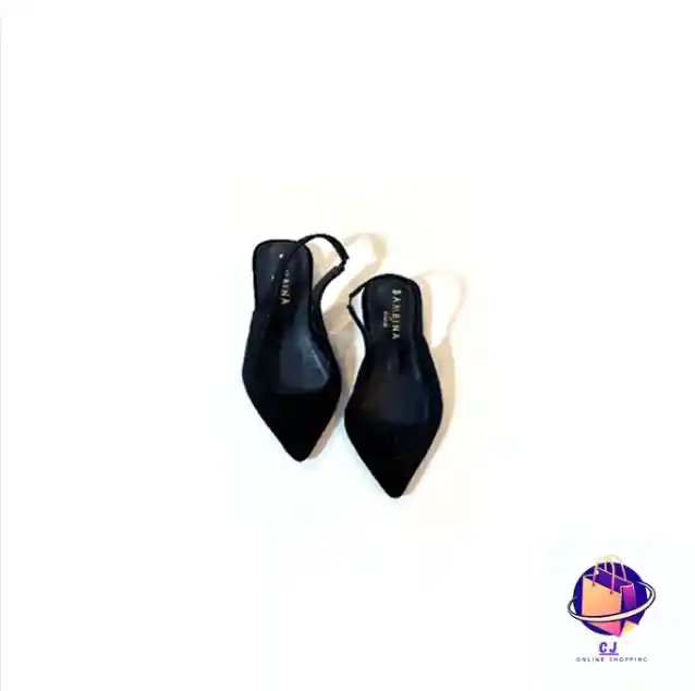 Sandalia femenina de diseño sofisticado en color negro, con punta fina y acabado tipo gamuza brillante. Cuenta con tira trasera ajustable que brinda mayor sujeción y comodidad. Ideal para ocasiones formales o looks elegantes.