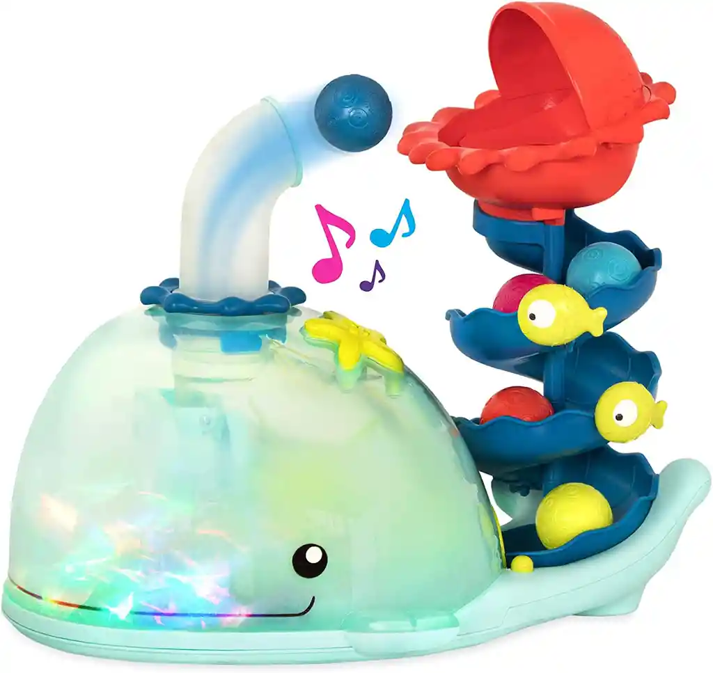 "¡A los niños y niñas les encantará esta ballena de juguete que hace estallar pelotas ! Su pico giratorio y su tobogán en espiral son lo que hace que esta adorable ballena sea tan divertida. Simplemente deje caer las bolas de colores en la parte superior del tobogán en espiral y observe cómo caen alrededor del tobogán en espiral y dentro de la ballena semitransparente. Luego, las bolas se disparan inmediatamente a través del pico de la ballena. Apunta donde caen las bolas simplemente girando el pico en la dirección deseada. ¡Incluso puede girarlo hacia la apertura del tobogán en espiral donde el proceso se repite continuamente, una y otra vez! Puede ser alimentado por USB. ¡Ahorra en pilas! Haz que el bebé gatee detrás de las pelotas. El cuerpo transparente fomenta el aprendizaje de causa y efecto. Gire o apunte el surtidor 360 grados. ¡Reproduce música y también se ilumina! Edad recomendada: 9 meses en aldenate."