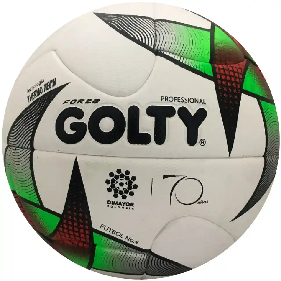 Descripción El balón Golty FORZA PROFESIONAL-T653895 N° 4 es el Balón Oficial del Fútbol Profesional Colombiano, maneja toda la tecnología Thermo Tech, la cual contiene una micro estructura de PU de alta calidad con un triple recubrimiento para darle una mayor resistencia a la esférica por la fricción brindando una durabilidad más prolongada. Este balón ha sido probado por los equipos con un resultado extraordinario. Superficies de juego: Grama artificial, Grama natural. El balón se envía inflado con la calibración recomendada de fábrica, (9 a 12 lb).• Impermeable brindando un peso estable para mayor control. • Alta retención de aire, para un mejor desempeño. • Buen rebote. • Estable en la trayectoria. • Resistente. • Total esfericidad. • Alta resistencia. • Alta suavidad. • Calidad certificada. • Peso 350 a 390 g. • Circunferencia 63.5 a 66.0 cm. • Rebote 110 a 155 cm.