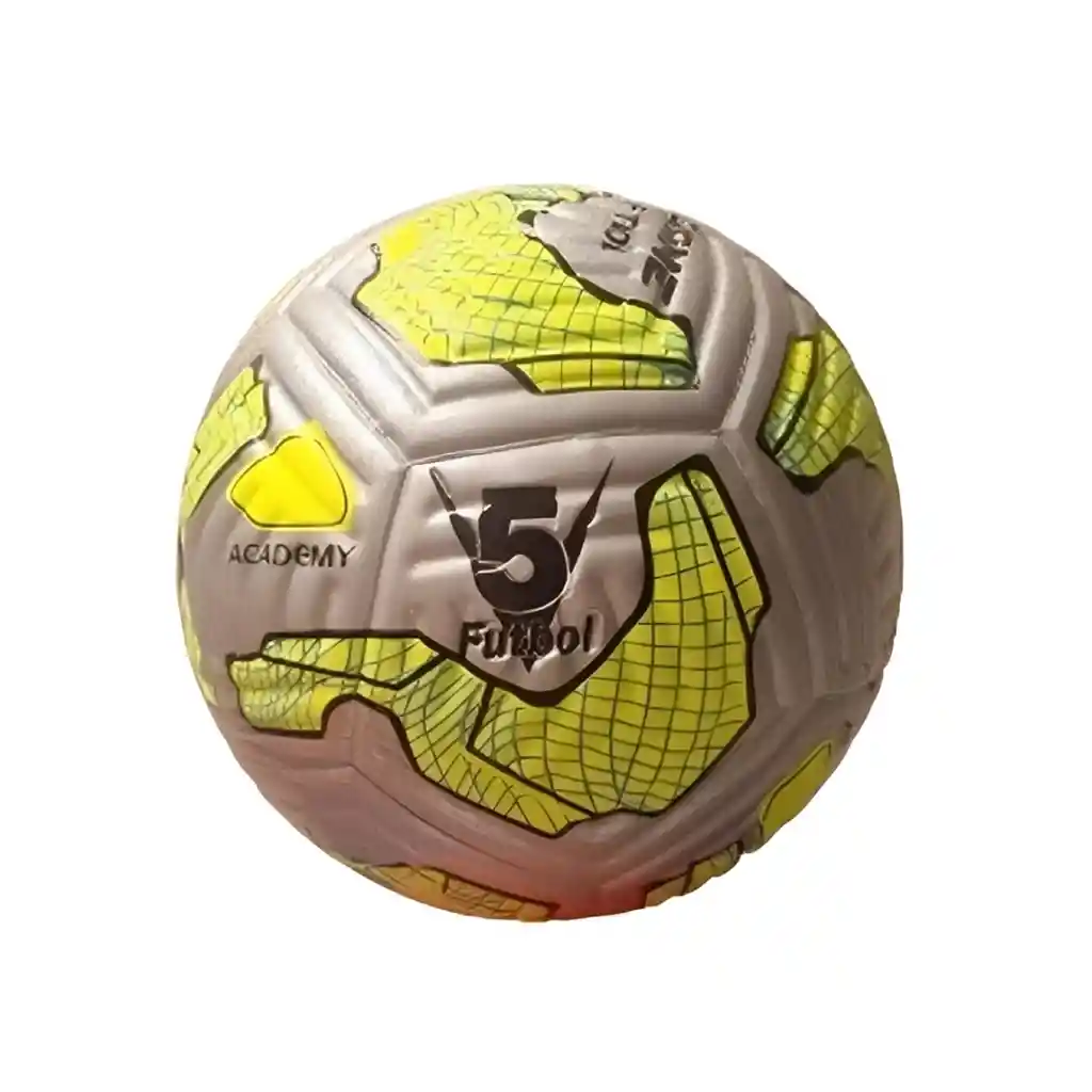 SKU: FB089 Número: 5 Cámara: en caucho de butilo. Enmallado: nylon. Cubierta: cuero PU. Construcción: laminado. Circunferencia 68/70 cm. Terreno de juego: interior y exterior. Total esfericidad. Color: Plateado / amarillo lima Marca: Game