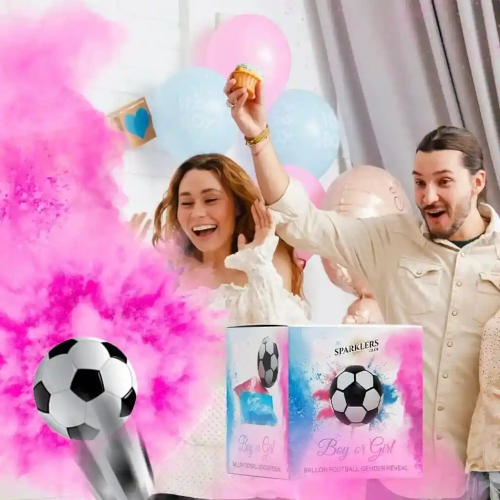 Es un balón de plástico que se abre para insertar polvo de color (rosa para niña o azul para niño). Uso: Al patear o golpear el balón, este se rompe, liberando una nube de polvo de color que revela el género del bebé. Contenido: Generalmente incluye el balón de plástico, polvo de color (azul o rosa) y, en ocasiones, calcomanías para personalizarlo.