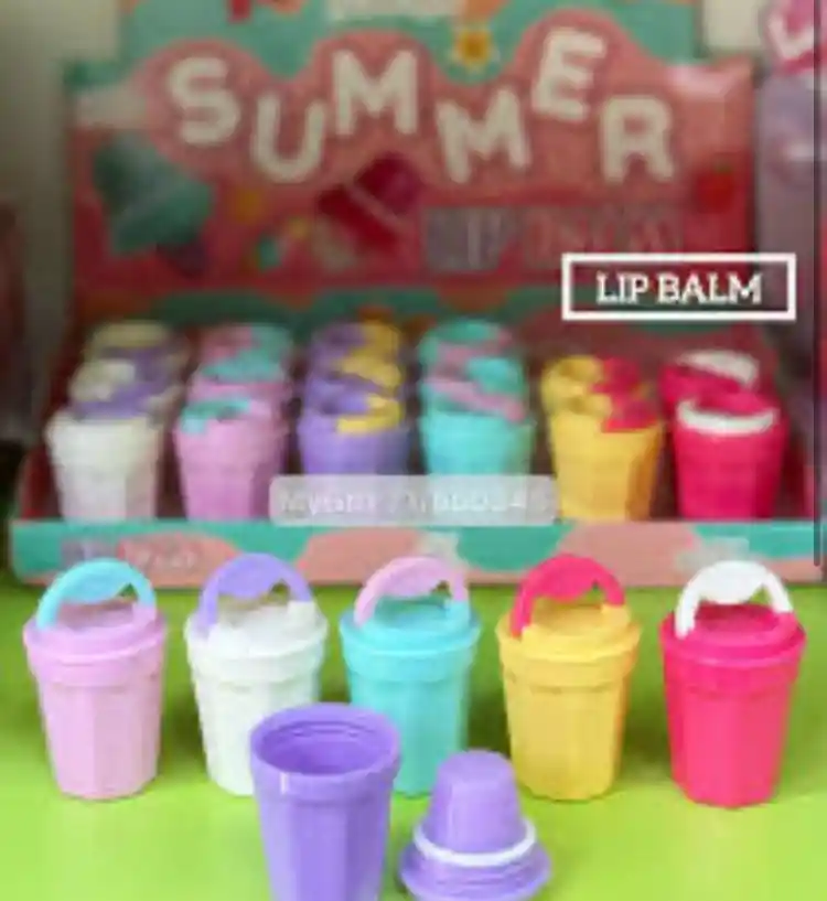 Pola Ayir Diseño: Contenedores de plástico con forma de cubo de playa en varios colores (blanco, rosa, morado, etc.) Temática: Verano, con ilustraciones de estrellas de mar, gafas de sol y helados en el empaque Uso: Producto cosmético para hidratación labial