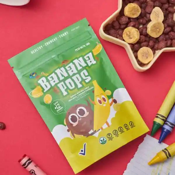 BANANA POPS - HEALTHY – CRUNCHY – FUNNY Deliciosa mezcla crocante de quinoa extruida sabor a chocolate con banana liofilizado - Extruded quinoa chocolate flavor and freeze-dried banana. Ingredientes: Quinoa, arroz, maíz, banana liofilizada, cocoa, sabor a chocolate. Ingredients: Quinoa, rice, corn, freeze-dried banana, cocoa, chocolate flavor. Sin gluten – gluten free Sin aditivos –additives free Sin conservantes – preservatives free Libre grasas trans – Trans Fat Free Peso neto: 30 gr Apto + 12 meses / + 12 months NSA-0012450-2022 *Puede contener trazas de nueces, leche y soya. Manténgase en un lugar fresco y temperatura ambiente. Consumir en el menor tiempo posible después de abierto el paquete. May contain traces of nuts, milk and soy. Keep in a cool place and room temperature. Consume as soon as possible after opening the package.