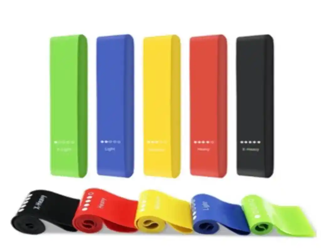 Un set completo de 5 bandas elásticas de silicona para entrenamiento y rehabilitación, diseñado para ofrecer distintos niveles de resistencia en rutinas de fuerza, estiramiento y movilidad.