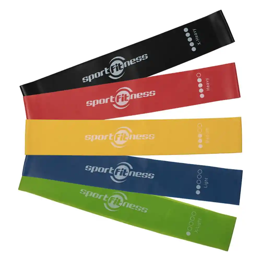 Este set de 5 bandas está fabricado en látex de alta calidad y viene en diferentes tamaños y resistencias para adaptarse a tus necesidades de entrenamiento. Material: Látex Medidas- Tensión Verde: 60x5x0,04 cm / 5 libras. Azul: 60x5x0,06 cm / 15 libras. Amarillo: 60x5x0,08 cm / 20 libras. Rojo: 60x5x0,1 cm / 30 libras. Negro: 60x5x0,12 cm / 40 libras.