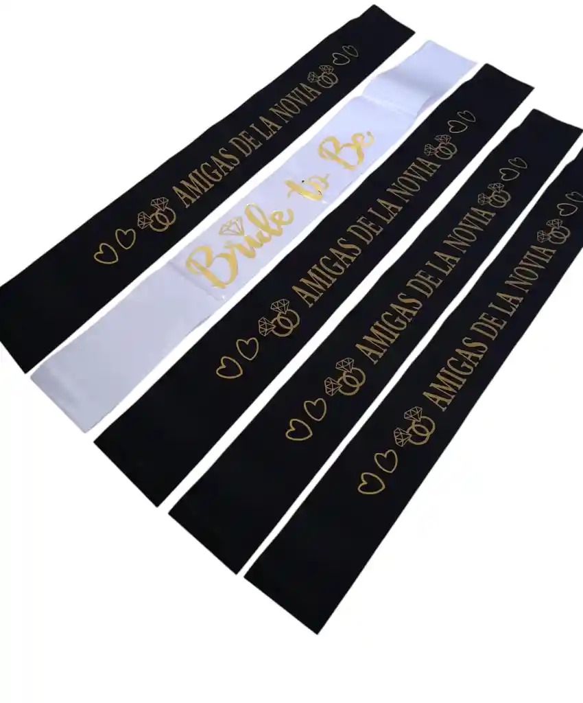 para novia despedida de soltera contenido 1 banda blanca de novia con frase dorada bride to be 4 bandas negras con letras doradas amigas de la novia perfectos para celebrar al lado de la novia indícanos si deseas adicionar algo mas y con gusto te colaboramos