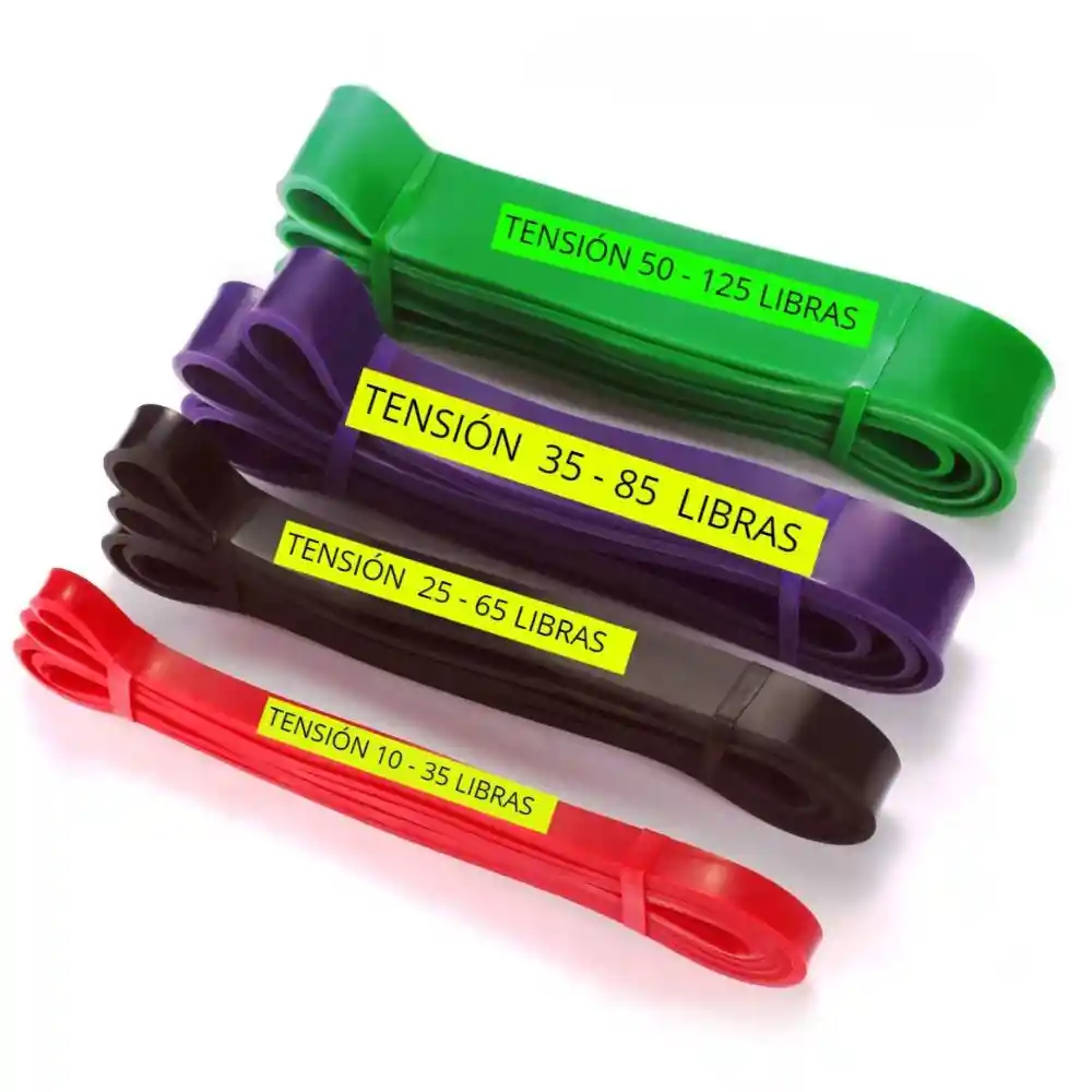 » CARACTERÍSTICAS: - 100% Nuevo y de Alta Calidad. - Color: Kit de 4 resistencias Roja, Negra, Morada y Verde. - Largo: 41" (104 cms) y de circunferencia (208 cms). - Ancho: Roja (13 mm), Negra (22 mm), Morada (32 mm), Verde (44mm). - Espesor: 4.5 milímetros. - Resistencia: Roja (10-35 libras), Negra (25-65 libras), Morada (35-85 libras), Verde (50-125 libras). - El precio publicado corresponde al Kit de 4. - Útil para casi todas las edades y niveles de condición física. _______________________________________________________________ » BREVE DESCRIPCIÓN: IDEALES PARA: - Entrenamiento Crossfit. - Entrenamiento de Velocidad y Agilidad. - Salto y Pliometría. - Aeróbicos y Estiramientos. - Entrenamiento Funcional de Fuerza y Flexibilidad. - Trabajo asistido en ejercicios como Dominadas, Peso Muerto, Sentadilla y Press Banco. - Adicionalmente, Ideal para ejercitarse, reducir grasa, aumentar masa muscular y tonificar, piernas, glúteos, brazos, hombros y espalda. - Las Bandas elásticas te permiten realizar ejercicios de resistencia y generación de fuerza. - Proporciona Flexibilidad y desarrollo de fuerza muscular. - Múltiples Beneficios para tu salud y poner tu resistencia a prueba. - Resistencia Efectiva para el fortalecimiento muscular, tonificación y entrenamiento de movilidad.