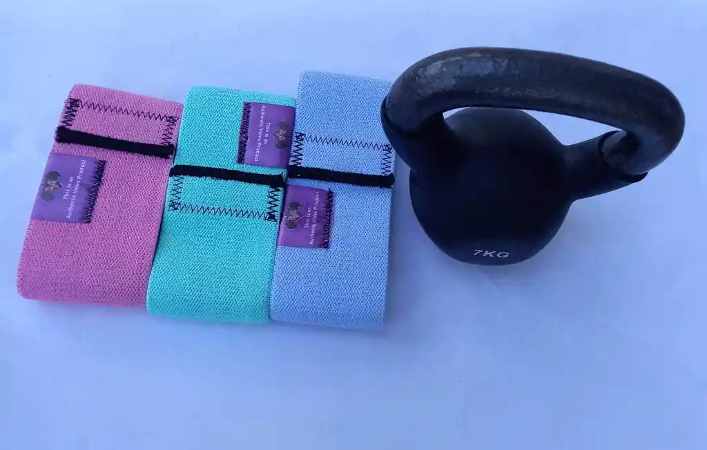 kit de bandas de tela premiun paquete por tres, y pesas en hierro encauchetada