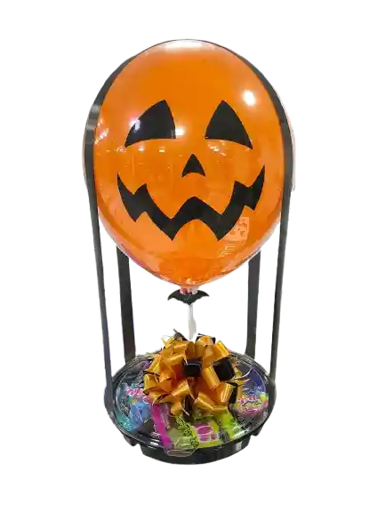 Globo grande personalizado, moño pompon, cintas decorativas, apliques, contenido entre frutas frescas variadas o dulces combinados