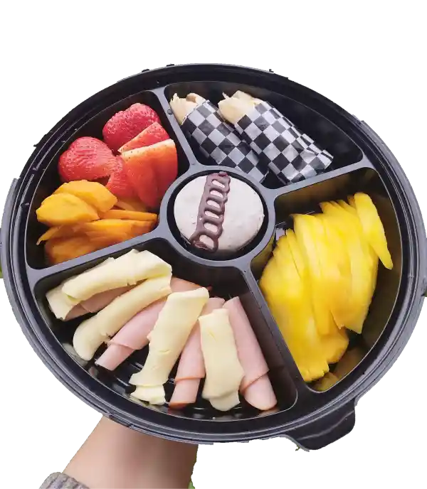 Hermoso y deliciosa bandeja buffet, contiene 2 burritos de pollo, fruta fresca picada, rollitos de jamon y queso, cup cake, viene en contenedor plastico con tapa de cuatro divisiones, tarjeta predeterminada de "Sonrie sera un hermoso dia "