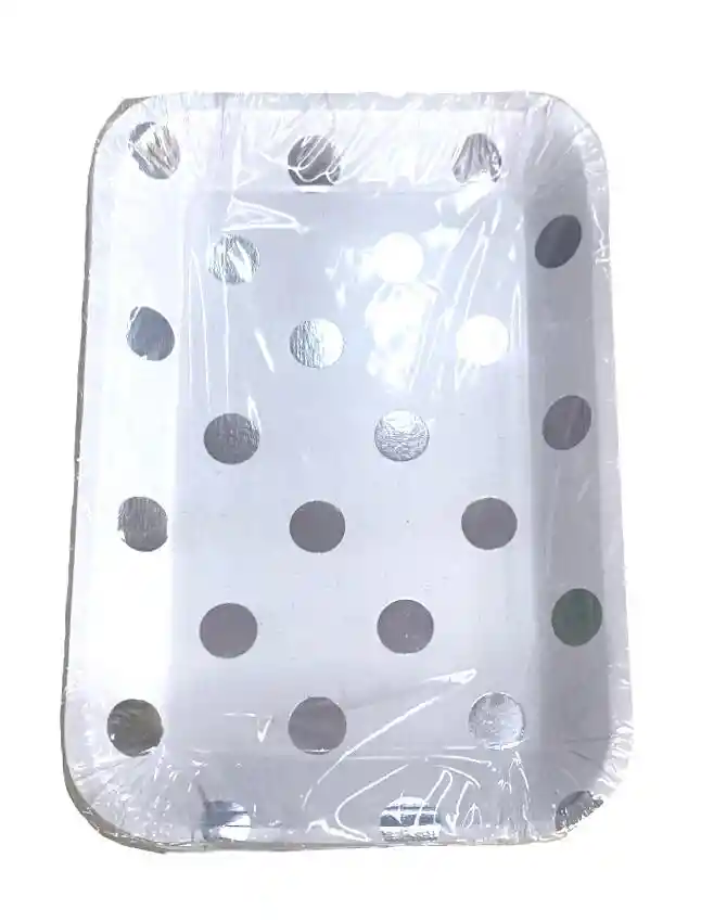 BANDEJITAS DE CARTÓN 14 CMS ANCHO X 20 CMS DE LARGO PAQUETE X 20 UNDS DECORACIÓN PEPAS PLATEADAS