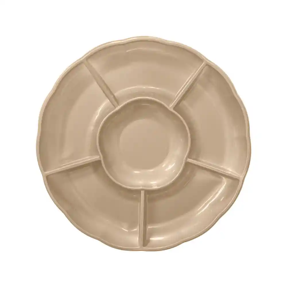 Dos bandejas circulares con 6 diviciones en color arena, ideal para mesa de fiestas o piñatas Bandeja para pasabocas Bandeja desechable