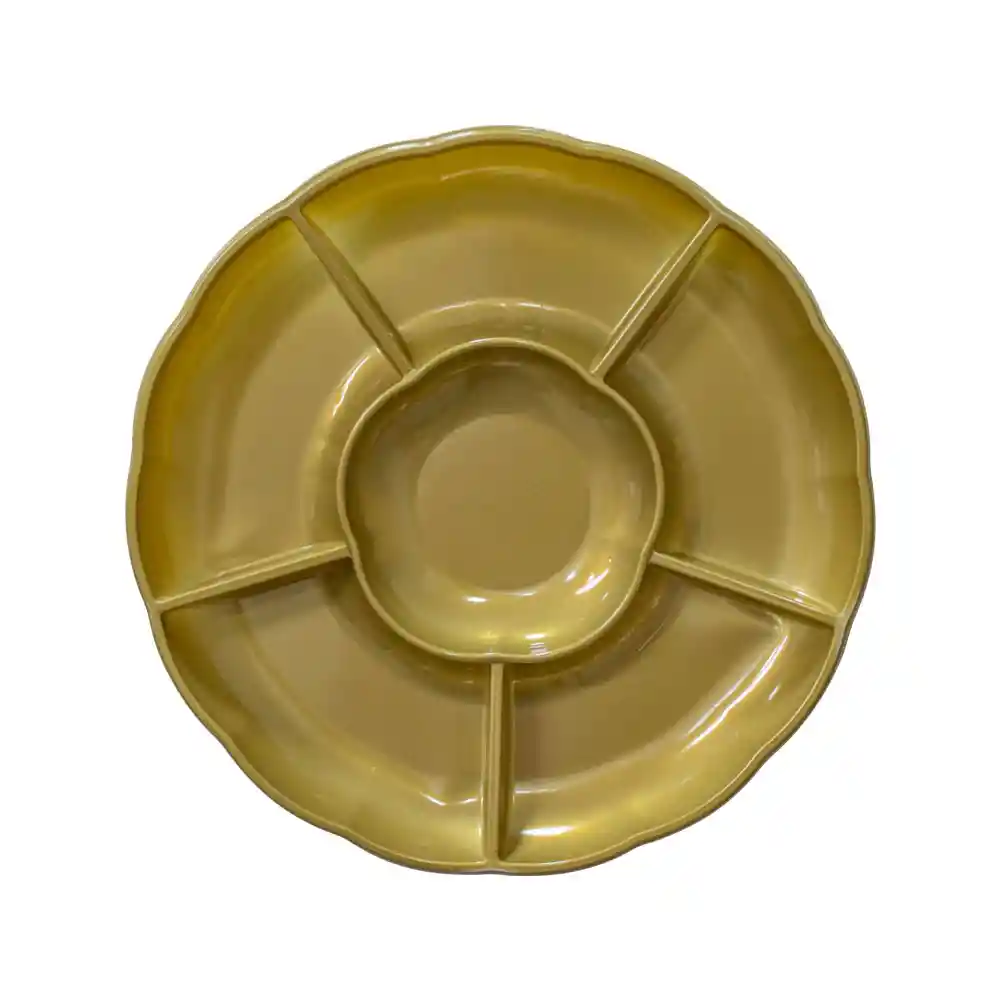 Dos bandejas circulares con 6 diviciones en color dorado, ideal para mesa de fiestas o piñatas Bandeja para pasabocas Bandeja desechable