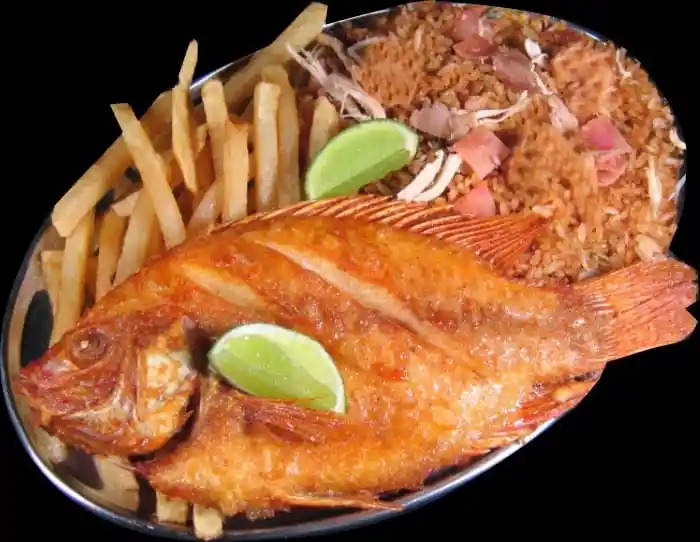Arroz chino ( camarones, jamón, cebollín chino, pollo desmechado, raíz china), tilapia frita, acompañamiento y ensalada.