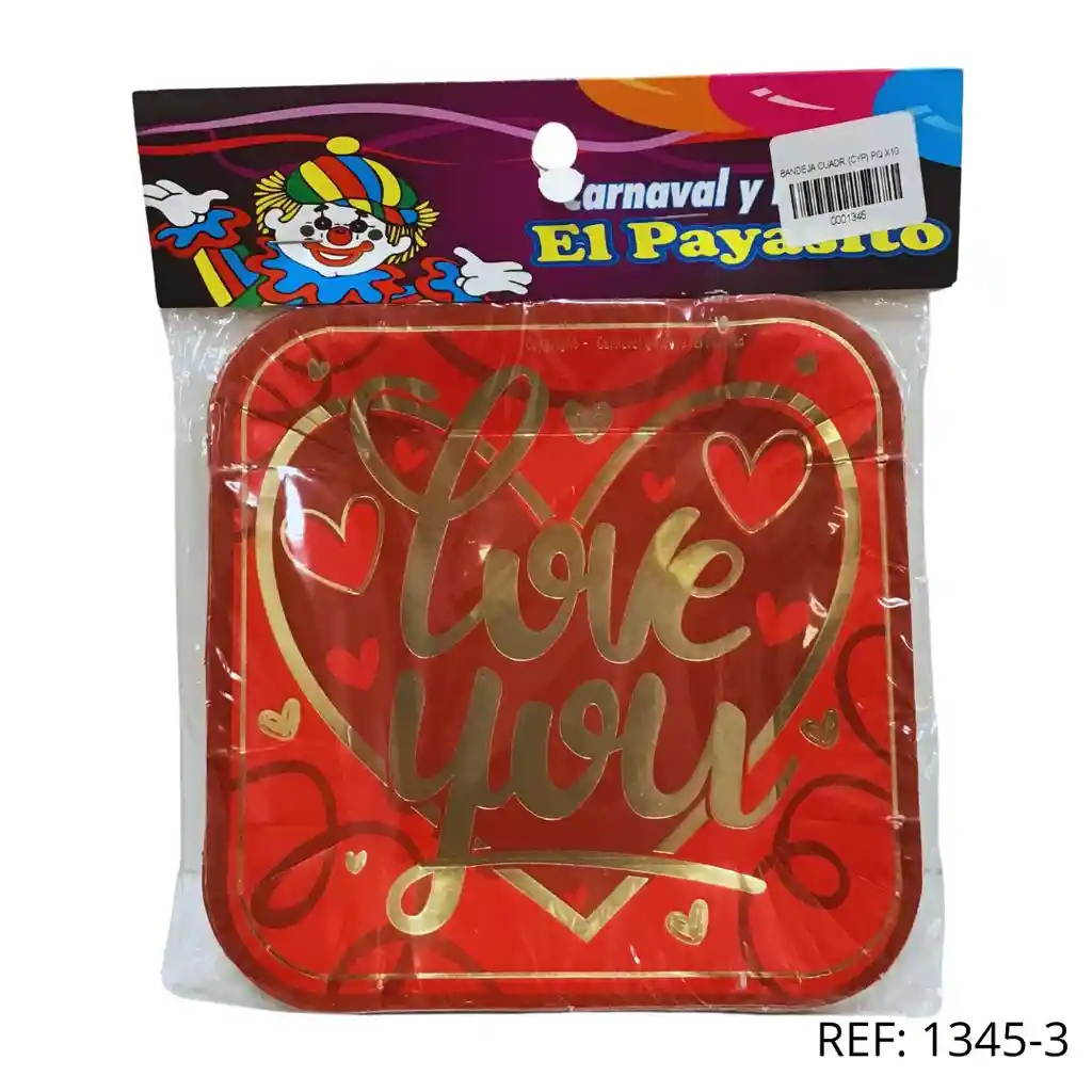 Platos cuadrados desechables con diseño romántico ‘Love You’ en rojo y dorado, perfectos para Amor y Amistad o celebraciones especiales