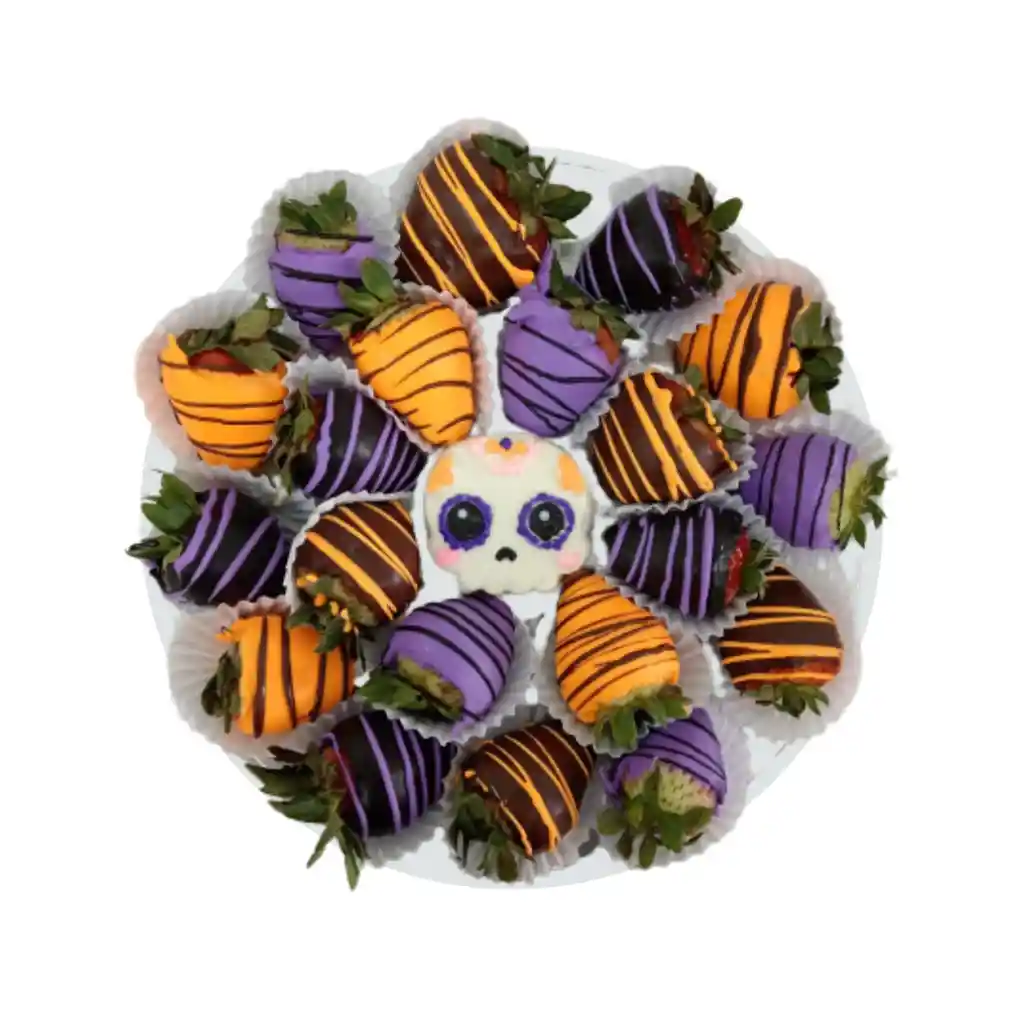 Deliciosa bandeja por 20 fresas con chocolate, temática Catrina. Puedes dejar el mensaje para la tarjeta dedicatoria en el chat de la orden