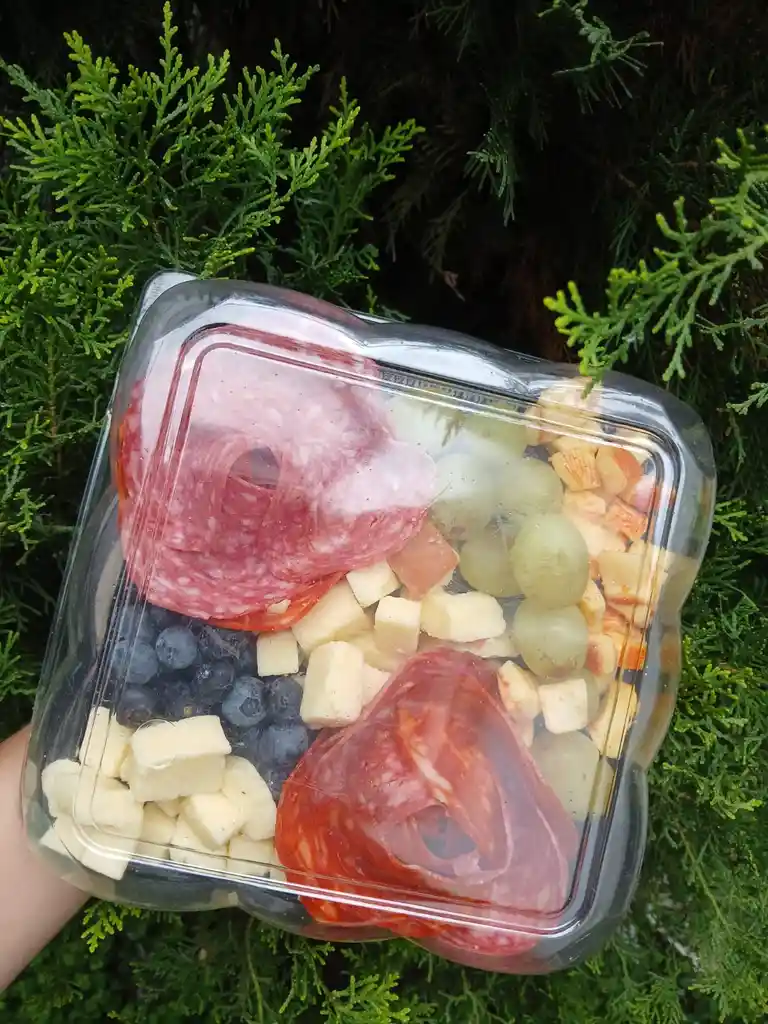 Bandeja de quesos pequeña con tres tipos de quesos, dos carnes, uvas, arándanos y jugo de naranja, bandeja decorada con moño y tarjeta